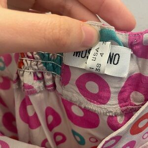 Incredible vintage Moschino Jeans strapless tea length cocktail dress. 100% silk polka dot pattern in magenta, teal, red, and periwinkle. Perfect for spring or summer wedding guest attire. Additional elastic has been added to the back to keep top in place. Can be removed upon request. Invisible zipper at side seam.