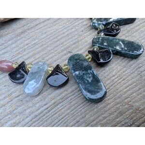 Amazing necklace made up of polished green and clear moss agate, black onyx and other gemstones. Accented with small glass beads. Tall agate stone measures 1.25"