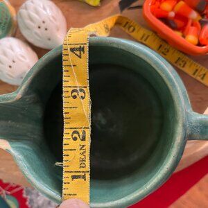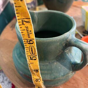 Green McCoy pottery, in a mossy color, a squatty pitcher, 5 inches deep. Small chip on pouring lip (see photo). Vintage - 1920s era. Handmade, with rings made in the bottom half of the pitcher. Natural spots and uneven color are part of the design. Ceramic. Diameter is 4" and height is 5". 7" at widest part.