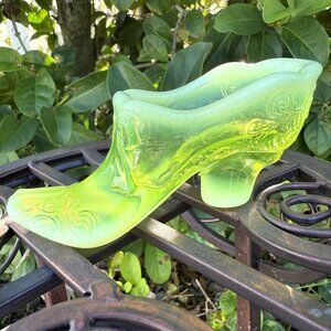Vintage Mosser Opalescent Vaseline Glass Bow With Scrolls Slipper Boot Glows