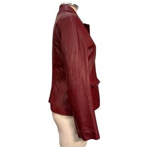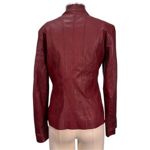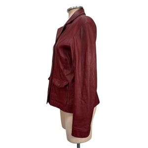 Features: 100% genuine leather outer fabric in a dark wine red. Collared. Pockets. Long sleeves. Button front closure. Lined