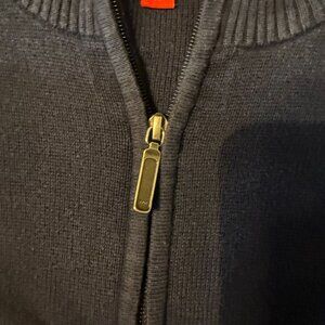 keywords: vintage sweater, Y2K fashion, Mossimo brand, navy blue, grunge style, zip-up sweater, 2000s clothing, retro apparel, cotton blend, acrylic blend, embroidered logo, men's large, full-zip