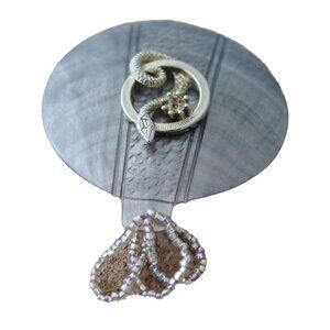Vintage Mother Of Pearl Fan Brooch With Snake & Beaded Tassel Accent