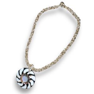 Stored in a pet-friendly and smoke-free home, this necklace has been well cared for and is in excellent condition. Embrace the bohemian vibes and add a touch of vintage charm to your wardrobe with this stunning Mother of Pearl pendant necklace.