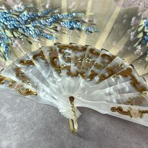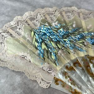 French hand painted mother of pearl with lace edges large hand fan. Exquisite piece! 19” open by 10” tall.