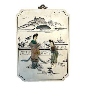 Add cultural elegance to your space with this vintage wall plaque featuring a serene Asian landscape and two finely dressed figures crafted from mother-of-pearl. The background is delicately hand-painted with traditional black ink detailing on a cream panel, bordered in black. The piece is mounted on a black wooden backing with a brass hanger and retains its original gold foil label marked “CPC Made in Macau.”