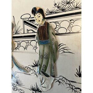 Vintage Mother-of-Pearl and Painted Wood Wall Plaque – Asian Scene – Made in Mac