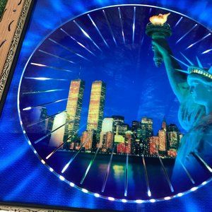 Vintage, maybe late 80s Statue of Liberty with New York behind it framed electric display. Has the world trade towers in the photo. You plug it in and lights flickers around the circle like fireworks. Good used condition.