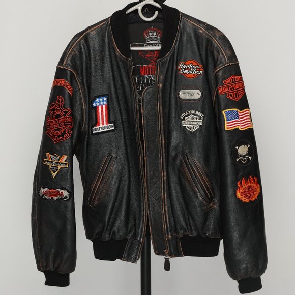 Motor Oil Vintage distressed leather jacket from Argentina. Baseball style jacket with vintage Harley Davidson patches that I put on in the late 80's... XL One of a kind for sure!! A little bit of wear on the inside. Yes I wore it for years. Sold Harley..... now selling this.. Thanks! Jeff