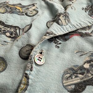 Unique vintage shirt-jacket with a soft flannel pajama-like texture and allover motorcycle print. Button-down front, relaxed fit. Originally a pajama top, now perfect as a lightweight casual layer. Fits like a men’s Large.