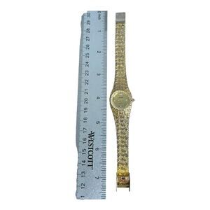 Vintage Moulin Quartz Watch Women Gold Tone Nugget Style Band Clear Stone Border around Bezel