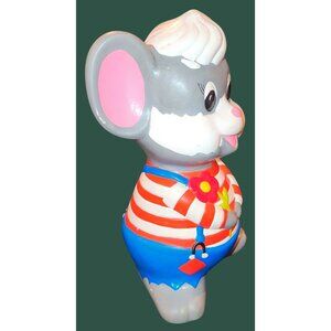 This vintage mouse coin bank is a charming addition to any collection. Crafted from durable ceramic, it features an adorable design with a red and white striped shirt and blue overalls. The whimsical style is eye-catching and functional, offering a delightful way to save money.