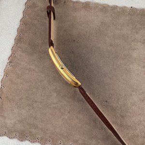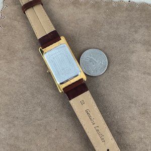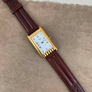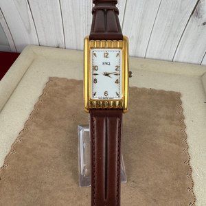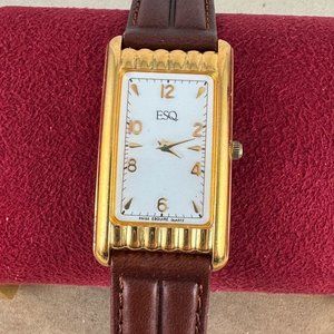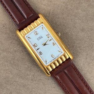 Vintage and Rare Gold Movado Esquire Sculptured Tank with Curvature Case White Enamel Dial/Face Arabic Numerals Gold Hands and Raised Markers. The Mineral Crystal, is almost perfect no visible scratches , 18K Gold Plated Case with Custom Padded Brown 9 inch ESQ Original Strap (Like New) Strap. Stainless Steel Back Excellent Condition. New Battery will be installed and Watch Cleaned (Pre Owned) Movado Case #300174 watch size 1 11/16 Lug to Lug x 15/16 Inches wide . Nice collectors watch get this as it’s getting harder to find this 1930's retro art deco 42MM x24.5MM wide made in the mid 90's unisex 18MM lug width comes with gold ton expansion bracelet UNISEX OS