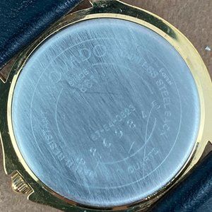 Vintage Movado Museum Gold Dot Swiss Quality Gold Plated Watch10 Microns 5.5MM Thick and a Sculptured 30MM 1/125 inches wide w/crown. Signed on back Movado 87-E4-D823 (Registered) 8269845 with Light Scuffed Sapphire Crystal Water Resistant Stainless Steel back New Battery Gold Buckle with Dot size to 8 inches New Battery serviced Case is real clean