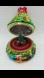 Vibrant metallic-glazed Christmas tree music box with a hinged lid. Exterior shows glossy green branches with gold garland, red bows, candy canes and gifts. The lid opens to a red stage with a mini village & rotating train circling a tree. Wind mechanism plays “Oh Christmas Tree".” Bottom retains factory stickers