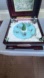 This vintage music box plays the tune "Winter Wonderland" while figurines of ice skaters move around a Christmas tree on a small rink.
