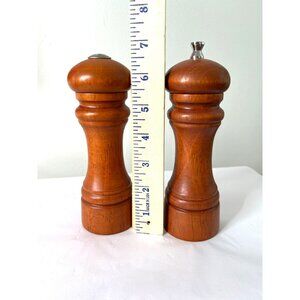 Vintage Mr. Dudley wooden salt shaker and pepper grinder set. Standing at 7 inches, this duo combines functionality with timeless aesthetics, perfect for any kitchen or dining setting.