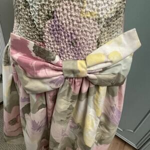 Excellent condition vintage Mr. Mort floral print drop waist dress, zips up the back with large bow detail at the waist, puff sleeves, has attached crinoline skirt for fullness