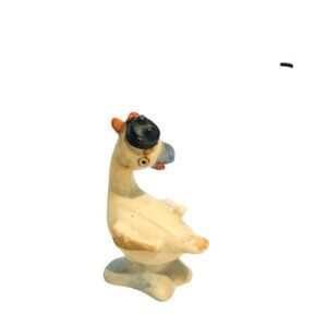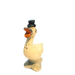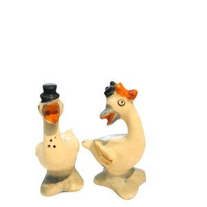 This is a set of vintage duck salt & pepper shakers. They are white with open beaks and one has a hat & the other a bow. They are ceramic and are 3.25” tall x 1.25” wide. Vintage 1960 – Made in Japan *Note -Some fading and wear due to age.