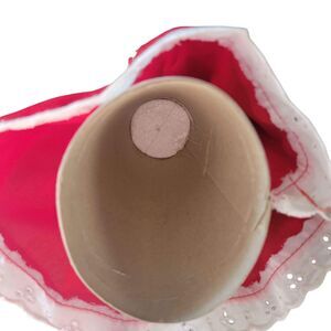 Great condition for age. I'm guessing this tree topper is from the 70s or 80s. Mr. Claus with a red felt dress and green jacket. Holding a gold present. She also has a small Christmas tree attached to her and some Holly in her hair. Some wear on her hands and face. The actual topper is made of cardboard.