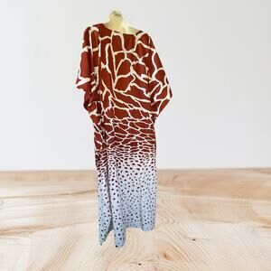 This is the outfit for you. You can’t help but flit through life in this amazing caftan. Silky, flowy material vibes with a beautiful ombré giraffe pattern. Let your inner red haired goddess out.