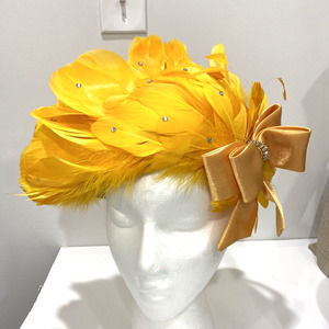 Vintage Ms Devine hat bright yellow feathers satin bow & rhinestones statement