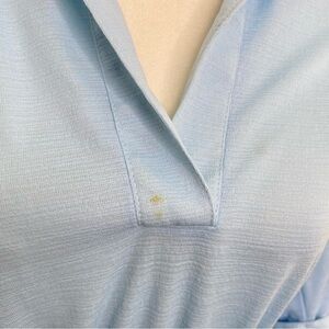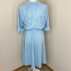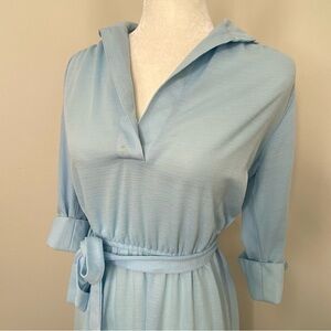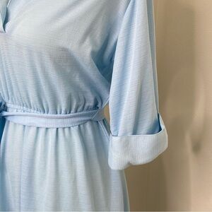 Vintage Ms Sugar Belted Midi Shirt Dress in pre-owned condition. See pics for wear. There is a mark on front by v-neck. Size 14. Runs small, see measurements. Color is blue. Original belt. Lightweight. Cuffed 3/4 sleeves. Approximate measurements are: 21” Chest, 10” Waist (elastic) 43.5” Long