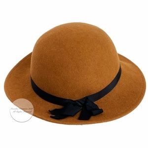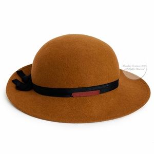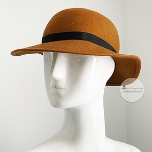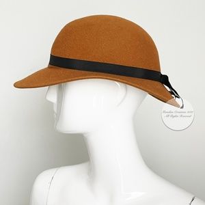 Vintage M'Sieu Leon Canadian Hat Montreal Canada, likely made in the 80s. Tan wool/unlined/ribbon around crown. Preowned/vintage with signs of use & prior wear: some glue residue on ribbon (see last image); hat would benefit from steaming/reshaping. No size tag, fits like S/M: appx 23in around outer crown/3in brim/21.5in inner brim/3.9in crown height.