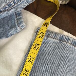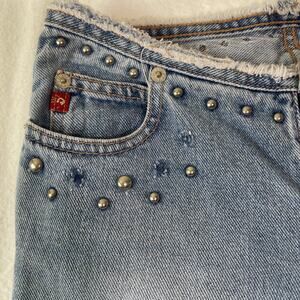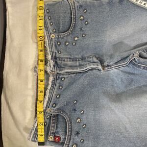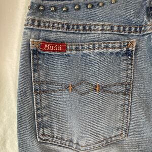 The Vintage Mudd Clothing Women's Flare Blue Jeans in size 1 are a stylish and unique addition to any wardrobe. These light wash jeans feature a regular fit with a flared style, perfect for a retro or hippie-inspired look. The denim fabric is machine washable for easy care, and the jeans are accented with studded detailing, buttons, and a logo for added flair. Button fly and no waist band add to the character. With a 5-pocket design and a length of 29.5 inches, these jeans are both fashionable and functional for the summer, fall, and spring seasons. Small rust stain back right pocket. Missing a few studs from front below packets (3) otherwise great vintage pair!!
