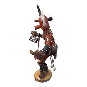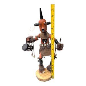 This unique Kachina doll reflects intricate craftsmanship, showcasing cultural artistry with striking details like feathers, a drum, and a horned figure design. Ideal for collectors or decor enthusiasts.