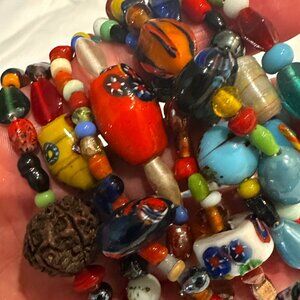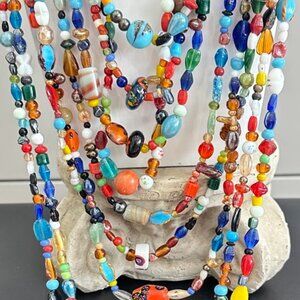 9 strand layered hand crafted necklace of trade beads in a rainbow of colors and sizes. Good condition, multi color glass beads. 42" length.