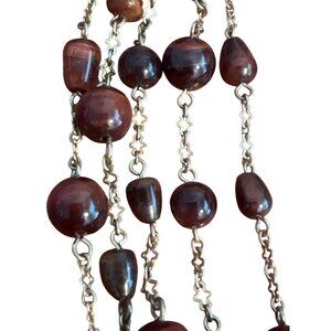This vintage necklace features multiple strands of brown and red cat eye beads, complemented by gold-tone accents, perfect for adding a touch of elegance to any outfit. Ideal for collectors and vintage jewelry enthusiasts.