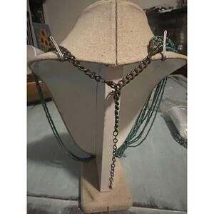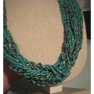 Vintage Multi Strand Beaded Turquoise and Bronze Beaded Necklace Braided Front. Add a touch of vintage charm to your outfit with this stunning multi-strand necklace! This unique piece features a beautiful combination of turquoise and bronze beads, creating a captivating and eye-catching design. The braided front adds an extra element of detail and sophistication.