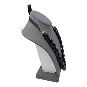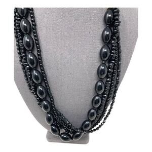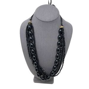 Vintage Multi Strand Black Beaded Necklace - multiple strands of black beads with a ribbon tie