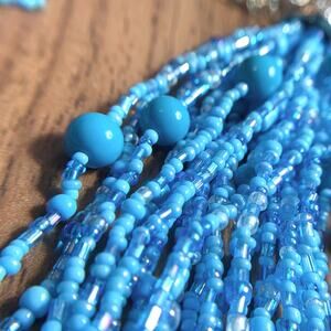 Features: Multi-strand collar construction; uniform glossy round beads; glass seed beads in assorted shapes; adjustable length chain; vivid blue palette