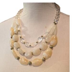 Features three strands of large oval and round marbled cream acrylic/plastic beads with ribbed gold tone spacer beads and clear faceted beads with rhinestone rondelle spacers for added sparkle.