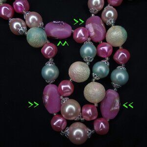 It speaks Spring! Perfect pastel multistrand necklace is two strands of fascinating beads. This is one of the good ones! That's because this one has a small collection of wonderful glass Givre beans strung on 2 strands along with pastel fake pearls as well as pastel ombre shaded beads. The pink givre beads with foil embedded are glass and all the other beads are plastic. There's a hook and extender and the hook is marked “Japan”. Early 60s and flawless. Mannequin neck is 13" around.
