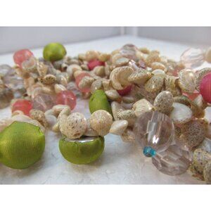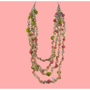 This multi 4 strand necklace combines natural shell pieces, colorful glass beads, and faceted accents. The satin ribbon tie allows adjustable length for versatile styling options.
