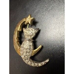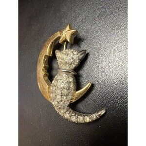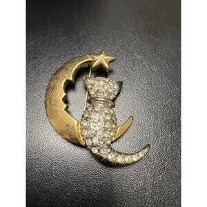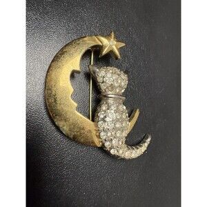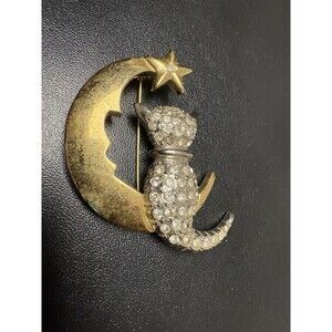 Vintage Multi Tone Moon & Kitty Cat Brooch Rhinestone Gold Tone. Condition is Pre-owned.