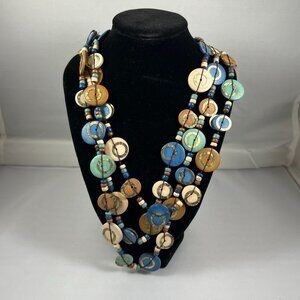 Vintage Multi-Layered Beaded Necklace With Hand-Painted Ceramic Discs In Earthy