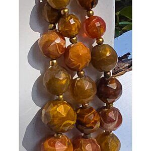 This elegant vintage necklace features a multi-strand design with amber and brown faceted beads and a secure gold-tone clasp, ideal for formal wear.