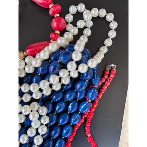 This collection of vintage necklaces combines vibrant red, white, and blue beads with faux pearls and gold-tone accents, offering bold and timeless style.