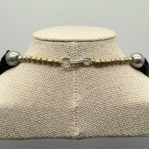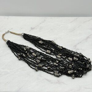 An enchanting piece of vintage jewelry, this multi-strand necklace showcases intricate black beads intertwined with tribal patterned beads. The stylish hook clasp adds a touch of timeless elegance, perfect for those who appreciate unique, vintage charm.