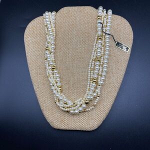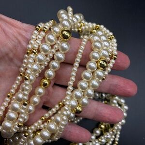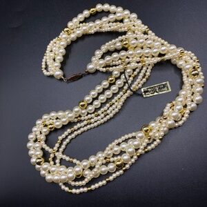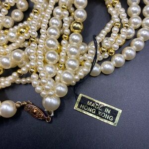 Vintage Multi-Strand Faux Pearl Twist Gold Accent Beads Necklace Hong Kong. Measures approx 25" with slider hook clasp. Very good condition, vintage necklace with "Made in Hong Kong" tag attached, likely unworn. #18