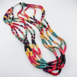 This vintage multicolor beaded necklace features strands of richly hued wooden beads in vibrant shades of turquoise, coral, mustard, purple, and black, accented with tiny gold-tone beads for a touch of shimmer. Its layered, draped design gives it boho-tribal energy with a retro 70s twist, perfect for making a bold statement. Lightweight yet full of texture, this piece brings an artsy, world-traveler feel to any outfitwhether styled over a flowy sundress, a denim jacket, or a linen blouse. A festival-ready, artisan-inspired necklace that radiates creative flair and effortless wanderlust charm.