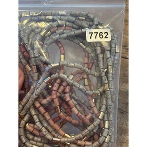 This intricately designed vintage necklace features a multistrand layout of pink and gray tube beads, accented by gold-tone details. It offers a timeless aesthetic, suitable for complementing elegant ensembles. The clasp ensures secure wear, adding both style and functionality to this unique piece.