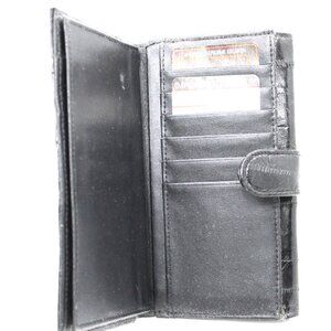 This vintage Mundi wallet is a must-have for anyone looking for a stylish and functional accessory. Made from genuine black leather and eel skin, this wallet features a double snap opening and solid pattern. It is perfect for women who want a hand wallet that is both fashionable and practical. With credit card, checkbook, photograph insert, and folding compartments, this wallet is perfect for everyday use. There is a double opening with a snap front and back closure. California Prop 65 Warning does not apply to this item.