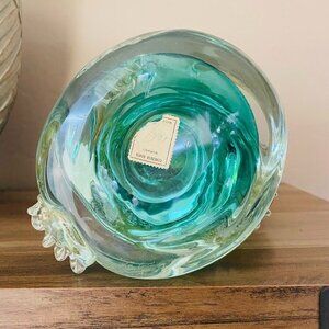 This vintage Murano art glass sculpture by Alfredo Barbini showcases a striking green and gold koi fish design. Standing 16" tall and weighing 12 lbs, this piece features intricate craftsmanship and timeless Italian artistry. A minor flaw is present on one edge, as marked, but does not detract from its overall elegance.