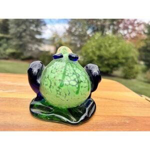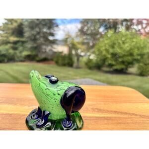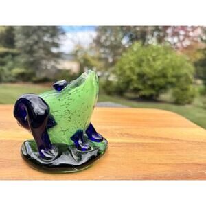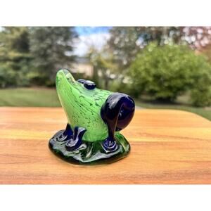Beautiful Vintage Murano Art Glass Frog Figurine featuring a vivid green body with deep cobalt blue accents and millefiori-style flower eyes. The craftsmanship and color blending exemplify Murano artistry, making this piece a striking addition to any glass or animal figurine collection.