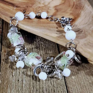 Vintage Murano Glass Beads White Silver Charm Bracelet
